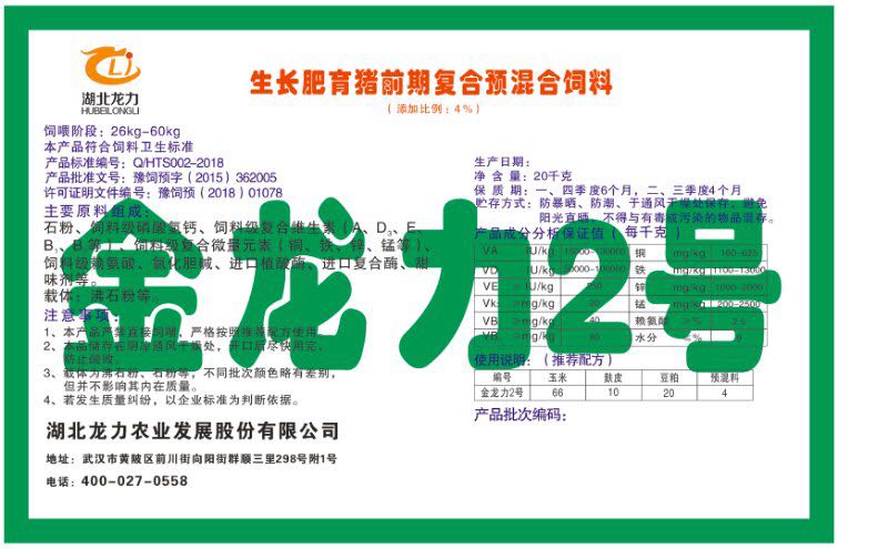 湖北龍力農業發(fā)展股份有限公司坐落于武漢市黃陂區前川街向陽街群順三里298號附1號。公司成立于2014年6月,公司自成立以來把“創(chuàng)全球最大養豬綜合服務”為企業愿景。致力于打造教保料品牌”作為公司發(fā)展的明確目標。公司一直致力于豬營養的研究和開發(fā),積極與國內外高校和科研機構合作,推廣養豬技術、動物營養新概念,向世界農牧企業學習與合作。公司采用國內先進的生產工藝,選擇高精度電子配料秤,高均勻度、無殘留混合機等先進設備....